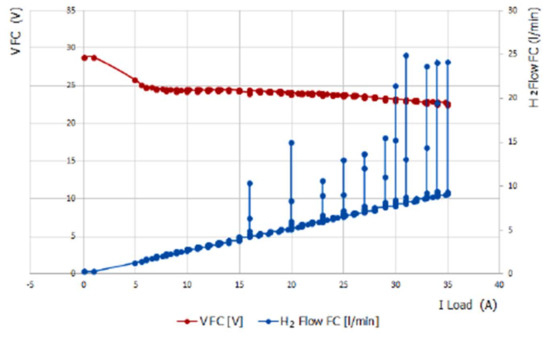where is the working current of the PEM fuel cell, and is the Faraday constant. The working characteristic curve of the PEM fuel cell is shown in Figure 8. The blue line represents the relationship between the fuel cell current and hydrogen consumption. The red line represents the relationship between the current and the voltage of the fuel cell. As the output current of the fuel cell increases, hydrogen consumption increases linearly and the voltage slightly decreases.