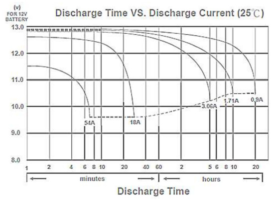 where R is the series resistance of the battery. The working characteristic curve of battery is shown in Figure 9. The figure shows the relationship between the battery voltage and discharge time at different discharge currents. As the discharge current decreases, the discharge time increases and the attenuation of battery voltage slows down.