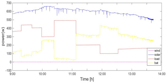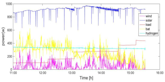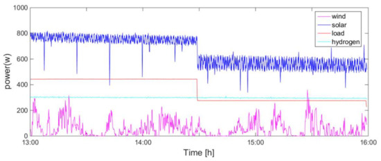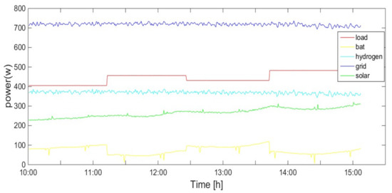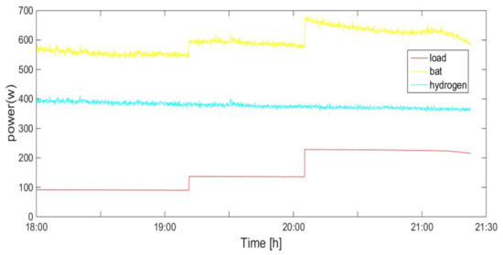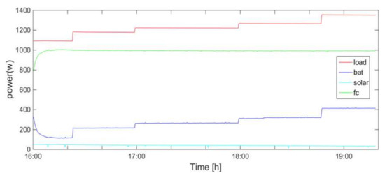 When the deficit power of the load is large, the battery and fuel cell all work to continuously supply the load, as shown in Figure 21. The intensity of the solar radiation is weak, at only 50 W, and the load power changes from 1100 to 1350 W. The output power of the fuel cell is 1 kW, but this is not enough to meet the load demand. The battery is discharged for its uninterrupted power supply. The trend of the battery output power is consistent with that of the load power.
