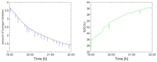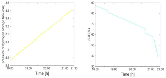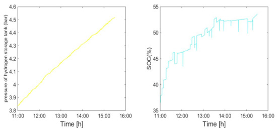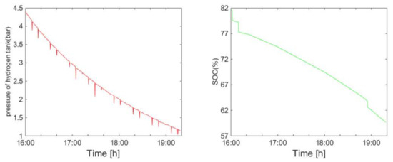 The pressure of the hydrogen storage tank and the state of charge are shown in Figure 24. The trend of hydrogen flow is consistent with that of the output power of the fuel cell. The pressure of the hydrogen storage tank decreases from 3.6 to 1.4 bar. The state of charge increases from 20% to 47%.