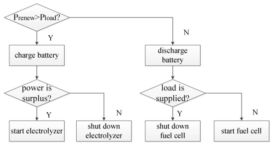 In [22,23,24,25,26], optimization schemes based on fuzzy inference and online learning are proposed, and simulations of the energy system carried out. As a result the power quality of the grid-connected system was improved. In [27,28,29,30], due to the intermittence and uncertainty of the renewable energy, different architectures of direct current (DC) transmission lines and hydrogen storage subsystems are proposed to reduce the adverse impact of power fluctuations on the power grid and improve renewable energy utilization. In [31,32,33,34], hybrid systems including renewable energy and hydrogen energy are modeled, simulated and analyzed. The dispatching schemes based on model prediction control improved the system efficiency. In [35,36,37], hydrogen energy subsystems are designed to effectively supplement and regulate renewable energy, considering the obvious seasonal characteristics of local wind and solar resources. In [38,39,40], solar power and hydrogen production systems are studied. Due to the intermittence of solar energy, batteries are introduced along with controllers designed to supervise the whole system. In [41,42,43,44], an economic analysis of a comprehensive system is carried out, and optimal scheduling schemes of the system are put forward. In [45,46,47], the application of a hydrogen energy subsystem is researched in order to suppress power fluctuations. The system’s operational costs and efficiencies are optimized through coordination control. The feasibility of the system is also studied. In [48,49,50,51], wind and photovoltaic power as main power sources are discussed, with an application scenario of residential power supply. Models based on integer linear programming are proposed, and the capacity allocation method is analyzed. In [52,53,54,55], a model of a multi-energy system is constructed, with operation characteristics analyzed in their off-grid applications. In [56,57], a hybrid system is proposed based on renewable energy and a fuel cell. Photovoltaic panels and wind turbines are modeled as the power flow, with load-following control regulating the system. The fuel economy was ultimately improved by switching strategies in the whole load range.