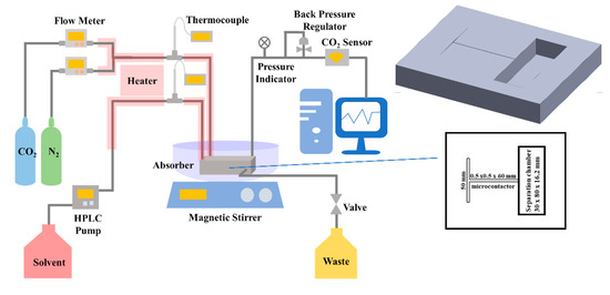 In this work, the rectangular microchannel made of aluminum alloy (AA1050) was used as a CO2 micro-contactor. The microchannel contactor system consisted of five sections including the inlet channels for CO2 gas mixture and absorbent, T-micromixer (500 μm) where the fluid streams were mixed, microchannel for CO2 capture (500 μm in width × 500 μm in depth × 60 mm in length) where the CO2-H2O absorption occurred, gas–liquid separation chamber, and outlet channels for gas and liquid streams. The microchannel contactor system and experimental set-up for CO2 absorption is shown in Figure 1.