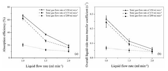 Effects of total flow rate of gas and liquid on the responses: (a) absorption efficiency, (b) overall liquid-side mass transfer coefficient.