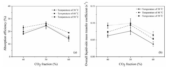 Effects of CO2 fraction and absorption temperature on the responses: (a) absorption efficiency, (b) overall liquid-side mass transfer coefficient.