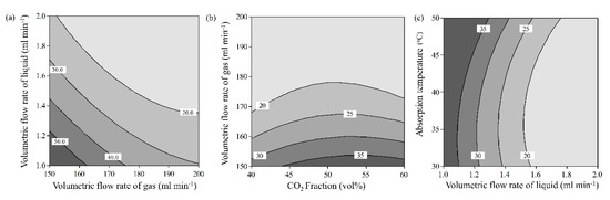 Interaction effect of variable pairs; (a) volumetric flow rate of gas and liquid, (b) volumetric flow rate of gas and CO2 fraction, (c) volumetric flow rate of liquid and temperature.