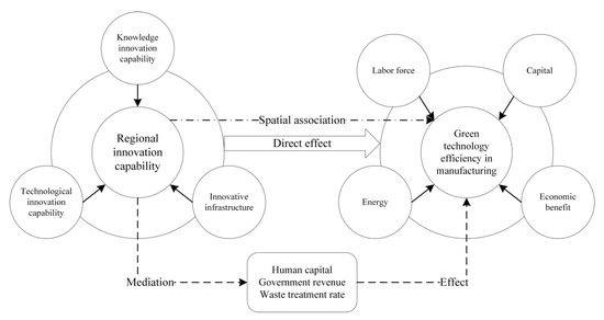 Regional innovation is the fundamental driving force for promoting social and economic development. It started with investments in technology development, with the ultimate goal of converting technological outputs into commercial value [31]. The direct impact of regional innovation capability on the efficiency of manufacturing green technology is mainly manifested in (1) enterprises innovating energy-saving and environmental protection technologies that change production methods and eliminating high-energy-consuming old technologies through new technologies, and (2) reducing energy consumption and pollutant emissions in the production process and realizing the improvement of green technology efficiency in manufacturing [32]. Based on these direct effects, this study proposed: