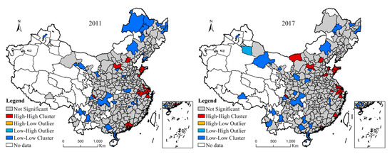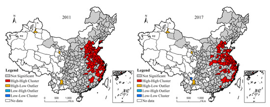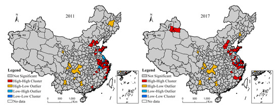 First, the applicability of the method was checked. The global spatial autocorrelation Moran’s I indices of China’s green technology manufacturing efficiency and the urban innovation capacity were calculated from 2011 to 2017 with the help of ArcGIS 10.2 software (Environmental Systems Research Institute, Redlands, CA, USA). The results showed that the Moran’s I estimates passed the significance level test with a confidence level of 99%, indicating that China’s green technology manufacturing efficiency and urban innovation capacity were spatially clustered. Thus, local spatial autocorrelation analysis could be used. This study selected 2011 and 2017 as the beginning and end time nodes, respectively, and drew the LISA cluster map of China’s manufacturing industry’s green technology efficiency, as well as its regional innovation capability level in terms of the spatial autocorrelation (Figure 2 and Figure 3). This study divided the local spatial units into four types: high–high cluster (i.e., H–H), high–low cluster (i.e., H–L), low–high cluster (i.e., L–H), and low–low cluster (i.e., L–L) to reveal their degree of association and distribution in the local spatial position pattern.