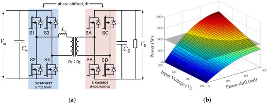 Figure 2. Main features of Dual-Active-Bridge converter: circuit schematic of the converter topology based on SiC MOSFETs or the primary and Si MOSFETs for the secondary side (a) and summary of output power delivery as a function of input voltage and phase-shift (b).