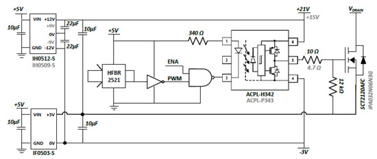 The gate drivers are bespoke designed, using non-symmetrical drive input voltage voltages for the SiC transistors on the primary side of −4 to +20 V and −4 to +15 V for the low voltage Si MOSFETs on the secondary side. Whereas a non-symmetrical drive voltage is a strict functional requirement of SiC MOSFETs, the choice to also apply an unsymmetrical driving voltage for the secondary-side Si transistors merely responds to cost containment targets, by enabling the design and production of a single gate-drive circuit, which can be adapted for both transistor types simply by replacing two ICs and one resistor in the circuit, with identical footprint. It should be noted moreover, that applying a somewhat higher (i.e., closer to zero) off-state bias voltage to the Si MOSFETs also allows to achieve faster switching transitions, with slightly reduced losses. Whereas the impact on overall efficiency is contained, the electro-thermal stress reduction in the transistor is interesting. For reference, the gate driver circuit schematic is shown in Figure 3. Insulation at gate-driver level is achieved by means of opto-couplers and signal transmission between control board and power cell is by means of optical fibers, ideal for avoiding electro-magnetic interference issues in reliability critical applications.