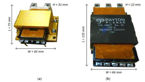 The magnetics are the other core components of the converter: the transformer provides galvanic isolation and voltage matching, the voltage across the series of its leakage inductance and the external inductor determines the current waveform flowing through the circuit. Since the transformer turns-ratio is relatively low, planar design of transformer and inductor are feasible and greatly interesting for increasing power density and improve thermal management; the components, shown in Figure 4, were custom designed and manufactured externally based on in-house specification. It is worth noting that the inductor could be realized as leakage inductance of the transformer, in the form of integrated magnetics. However, since its value is a key parameter of the converter control and dynamic characteristics, as well as of the ZVS load range, keeping the two components separate enables easier design optimization and better transformer thermal management. The switching frequency was chosen to be 100 kHz to start with and the transformer turns ratio was 19:2. After fixing the switching frequency and the turn ratio values, the maximum power and ZVS load range depend on the series inductor and the controllable phase-shift. Hence, an inductance value capable to satisfy the power constraints needs to been selected.