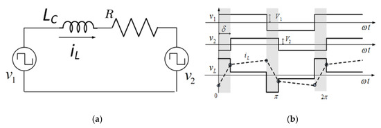 Figure 5. Dual-active bridge (DAB) basic equivalent state-space average model (a), and characteristic voltage and current waveforms illustrating the control principle (b).