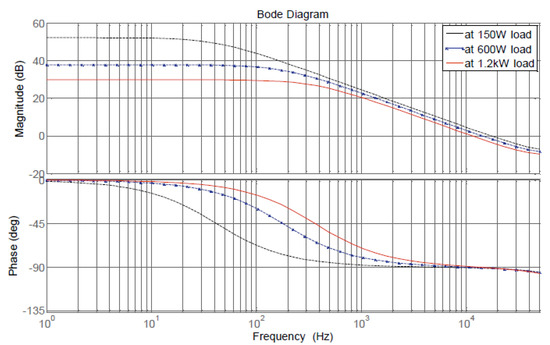The open loop dynamic characteristics of the converter are shown in Figure 6, in terms of its Bode-plot gain and frequency Bode-plots. It is important to underline that the converter DC gain, bandwidth and phase-margin are load-dependent, an aspect which needs to be duly taken into account when closing the loop.