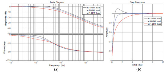 Figure 8. Dynamic response characterization of the converter (simulation results): closed-loop Bode plots (a) and system step response at different power levels (b).