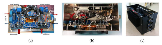 Figure 9. Photographs of developed hardware: single DC-DC converter cell (a); view of cased converter and control board, with details of wiring, and connectors (b); external view of cased unit (c).