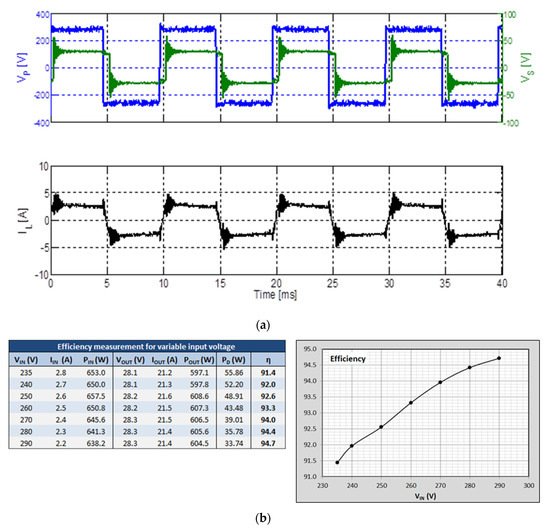 Figure 10. In (a), transformer primary and secondary voltage waveforms (top) and series inductor current (bottom); in (b), efficiency and detail of average voltage and current values.