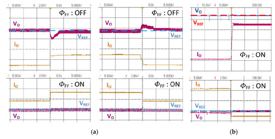 Figure 12. Scope snapshots of output voltage variation in the presence of abrupt and large step changes in the load (±5 A in (a) and ±15 A in (b)), without (top) and with (bottom) feed-forward loop, respectively.