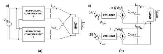 Figure 13. (a) Parallel connection of 2 BDCs; (b) controlled current source equivalent model.
