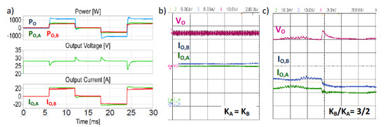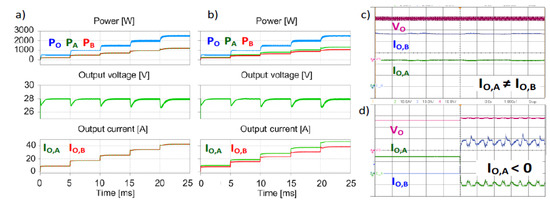 Figure 16 shows the results obtained on the lab-prototypes for different power requests, after the implementation of this method. The tests confirm that the management of the energy is realized in good agreement with simulations and the output voltage is well regulated. The main advantage of the proposed solution is the fully controllable load sharing, which can be achieved with great accuracy in a simple and straightforward manner; the main limitation to its deployment is the need to exchange information between converters, which can become problematic in the case of multiple parallel modules if fast dynamic response is required. Loss of the communication-link or failure of the master unit would result in system shut-down.