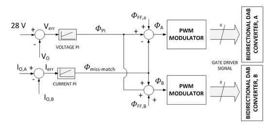 Therefore, in this configuration, the aim of the control was still to regulate the load voltage, but also to ensure proper sharing of power delivery between the two modules. The corresponding equivalent control scheme in this case is illustrated in Figure 15. The methodology employed here consists in decoupling the control loops: one converter, acting as the master unit, ensures control of the output voltage to a constant value with the modality described in the previous section; the other, acting as a slave unit, is in charge of power sharing and operates in current control mode. The output current of each converter is sensed and the information is shared via a dedicated communication bus. The voltage controller in the salve unit is disabled and the master output current is fed-back as the set-point of the slave feedback-loop to determine the phase-shift. The feed-forward loop can also be added with a similar approach for both modules.
