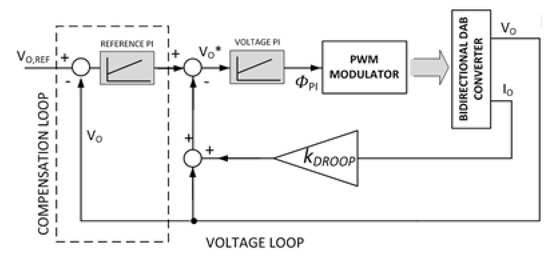 Droop control is also a well-known practice used in power systems to share power among different generators. This concept has been recently proposed for other kinds of applications, such as speed control for integrated modular motor drives or modular DC/DC converter for smart transformers [10,11]. In this case, the droop control, illustrated in Figure 15, could be a suitable solution to enable parallel connection and to allow power sharing among the DABs; moreover, it does not require any communications between the BDC modules. The concept is to add a virtual resistor (Kdroop) into the feedback loop, which drops the internal voltage set-point (VO,ref) as a linear function of the output current (Io)