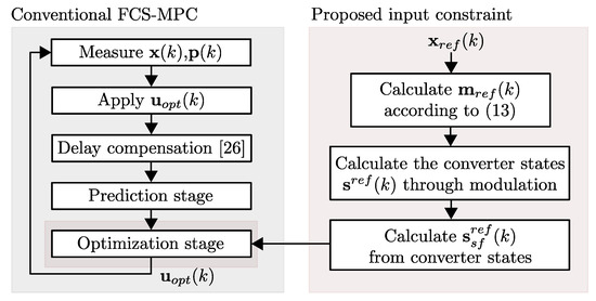 The resulting algorithm is shown in Figure 5. In each sampling time, the FCS-MPC controller selects the state that minimizes the cost function J. Because in a steady-state, it is expected that the reference tracking term is close to zero, and the selected state will depend mainly on the proposed input restriction. Thus, the FCS-MPC controller will select the state that generates the closest converter switching function to the one proposed by the input restriction.