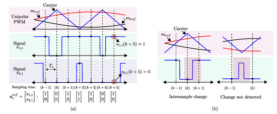 The comparison between and the carrier signal can generate at most two transitions in each signal and . Because these signals are sampled or calculated each sampling time, it is possible that there are one or two transitions between samples if the sampling time is high (Figure 4b). When one transition occurs in the middle of a sampling time, its value will be naturally considered in the next sampling time. In the proposal, one change between samples is not a problem because the strategy is not allowed to change between samples as an FCS-MPC controller is used (its output can only change at the sampling times). When two transitions occur, the switching function associated with the cell will be the same in two consecutive sampling times. This condition is a problematic issue because the proposal seeks to impose a PWM waveform, and losing pulses results in changes in the desired harmonic spectrum. However, both issues can be avoided increasing the ratio between the sampling and carrier frequency, e.g., for a carrier frequency of 550 Hz and a sampling time of 10 kHz, there are 18 samples per carrier period, which translates to a resolution of 0.1 ms.