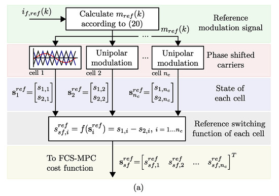 As shown in the previous section, the proposal does not change the flowchart of the conventional FCS-MPC, independently of the power converter used. This allows for using the scheme in any power converter that operates with conventional FCS-MPC. As a case study, the proposal is applied to a single-phase CHB converter, which was presented in Section 2. When an FCS-MPC algorithm is used in this converter, it is necessary to include an additional stage to ensure even power distribution among the cells [24]. Using the proposal, this feature can be naturally achieved with a fixed switching frequency and a concentrated harmonic spectrum. The steps described in Section 3.2, and applied to the CHB converter, correspond to