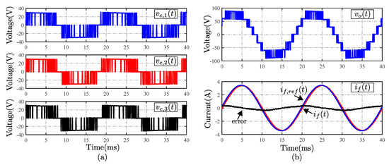 Figure 7 shows the steady-state performance of the system with conventional FCS-MPC for a current reference of 3.5 A. The average value of each cell output voltage is similar among them, due to the use of the strategy presented in [24], Figure 7a. These values are summarized in Table 3. The sum of these voltages generate the typical 7-level waveform in the output of the CHB converter, Figure 7b; while the current tracks the reference with an error of 4.85% at the fundamental frequency. Figure 7c shows the typical spread spectrum obtained with a conventional MPC scheme, with concentrations around /11 and /6. The average switching frequency per semiconductor (ASF) is equal to 1.97 kHz, which is 79.6% higher than the achieved using a modulated scheme with a carrier frequency of 11 p.u.
