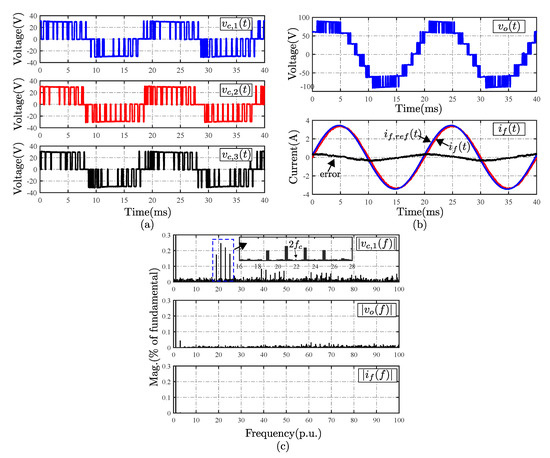 Figure 8 shows the steady-state performance of the proposal operating with a carrier frequency of 11 p.u. The fundamental output voltage of each cell is similar (Table 3), Figure 8a, with a converter output voltage of 7-levels as the conventional FCS-MPC, Figure 8b. The output current follows the reference with an error at the fundamental frequency of 5.71%. Figure 8c shows the key harmonic spectra for the proposed FCS-MPC. The proposal allows for obtaining a well-defined harmonic spectrum around twice the carrier frequency for the cell output voltage—while, in the case of total output voltage, the harmonics are concentrated around six times the carrier frequency, due to the phase shift modulation used. The average switching frequency of the proposal is 1.2 kHz, which is 40% less than conventional scheme and 9% higher than a modulated scheme with the same carrier frequency.
