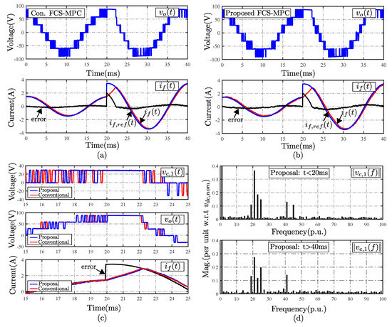 The proposed strategy is tested for a step-change in the current reference of 133%, from 1.5 A to 3.5 A at t = 20 ms, as shown in Figure 9. The conventional and proposed FCS-MPC show a similar dynamic performance, which can be seen in Figure 9a,b, respectively. This can be inferred by comparing the output voltage applied by the CHB converter in both cases. For instance, the results of Figure 9c show that, immediately after the current step-change, both strategies select the same voltage vector. Finally, Figure 9d shows the voltage harmonic spectrum for the proposal associated with cell number 1, before and after the current change. It can be seen that the proposal allows for fixing the harmonic spectrum around twice the carrier frequency, independently of the change on the system operating point and without requiring to change the associated weighting factor.