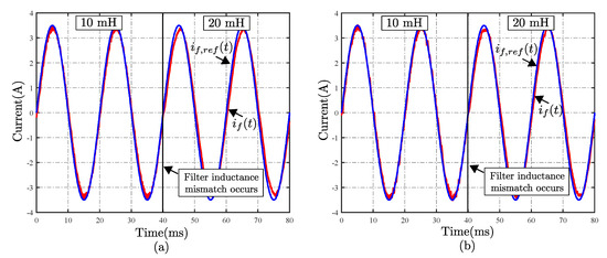 In this section, the sensitivity of the conventional and proposed FCS-MPC under a change of 50% in the inductance value is evaluated. The change is made at t = 40 ms from an inductance value of 10 mH to 20 mH while the current reference is set at 3.5 A. The initial value of the inductance used for both FCS-MPC algorithms is 10 mH. The results achieved for this test are shown in Figure 10. The conventional scheme tracks the reference, despite the change in the inductance value, with an error at fundamental frequency of 0.15 A before the change and 0.17 A when the inductance value is 20 mH, Figure 10a. In the case of the proposal, Figure 10b, the error at 50 Hz before and after the change are 0.1 A and 0.2 A, respectively. These results show that the proposal allows for fixing the harmonic spectrum and switching frequency, without considerably altering the conventional FCS-MPC performance under parameter mismatch.