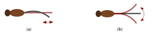 Figure 2. Dragonfly side view showing longitudinal tail actuation modes. (a) Tail contraction and extension. (b) Tail up down wag movement. - Tail up down wag movement, illustrated in Figure 2b and will be referred to as “Model 2”.