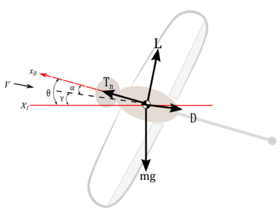 Summing the forces acting on an aircraft, parallel to the flight path as shown in Figure 4, the velocity change equation yields [41,42],