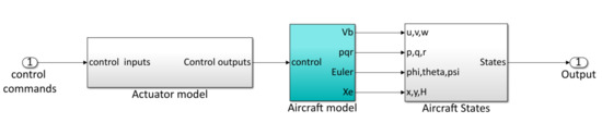 The specifications of the aircraft model used in this study are chosen to represent an electrically powered fixed wing aircraft with a mass distribution reminiscent of a dragonfly (see Figure 3). The datum which the position values are obtained with respect to is chosen as the leading edge of the wing. The implementation of the mathematical models was carried out in the MATLAB/Simulink simulation environment [43]. Figure 5 shows the Simulink model of the aircraft. The “Actuator model” produces the control inputs to the “Aircraft model” which contains the nonlinear equations of motion to then produce the aircraft state vector .