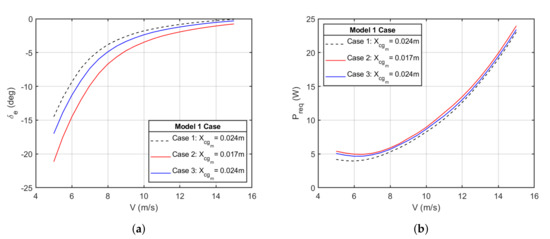 For Models 1 and 2 aircraft and for all cases relating to correction of imbalance in steady level flight, the plots for elevator deflection required to trim with respect to airspeed are consistent; the amount of elevator deflection required to trim decreased with increased speed because higher air speeds require less lift coefficient and consequently less angle of attack [39]. The power required plots as a function of airspeed also present consistent results as increased weight results in more lift required and consequently, an increase in induced drag (see Figure 8 and Figure 9) [39].