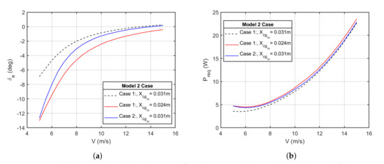 The neutral point of the aircraft planform analysed in this study was estimated in AVL, as ( 0.046 m). In order to isolate the tail mass movement, rigid body and the disturbance mass were combined to form a rigid body with a constant mass and mass distribution. The mass and inertia properties of the newly defined rigid body were estimated in XFLR5 and are listed in Table 4. The traditional method to instantaneously correct imbalance or disturbance of aircraft is to use aerodynamic control surfaces to create opposing forces. We calculated the control effort for Models 1 and 2, for a stable trimmable steady cruise flight condition at airspeeds ranging from (V = 5–15 m/s) with an increment of 0.5 m/s. The evaluations carried out for both tail actuation modes are described in the sections that follow. In most small electrically powered aircraft, at least 50% of the power available is used for propulsion [58], therefore, the less propulsive power consumed, the longer the aircraft can fly on less energy. For steady cruise, lift balances the gravitational force and the net thrust balances the drag , therefore, the specific power is zero. The energy required in cruise as a function of time can be estimated by: