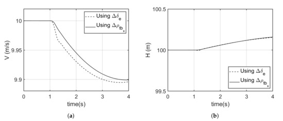 For both models, the objective was to calculate the nominal values of the pitch angle and control inputs and for cruise speed m/s and height m. In addition, there was no tail deflection and the tail position was fixed at ( 0.564 m) for both models. No tail deflection infers that for Model 2, ( 0.264 m) and ( 0.3 m). The models were trimmed without actuator dynamics using the Matlab/Simulink linear analysis tool [43]. The trim results are presented in Table 3.
