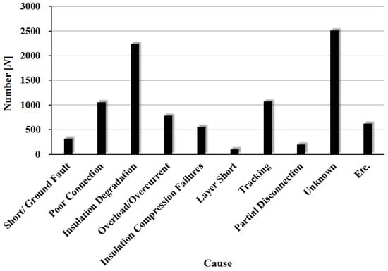 According to data from the Korea National Fire Data System, a total of 40,103 fire accidents occurred in 2019, resulting in 2515 human casualties and 854.4 billion won in property damage. The causes of fire accidents showed that carelessness accounted for more than 50%, followed by electrical factors at about 24%, mechanical factors at 10%, unknown factors at 9%, and other causes at 7%. Moreover, carelessness and electrical accidents were also the greatest causes of human casualties. Figure 1 shows the causes of electrical fires in 2019. It can be seen that more than 50% of electrical fires were due to insulation deterioration, contact failure, compressed insulation, and loose connections, which can lead to the series arcing [,].