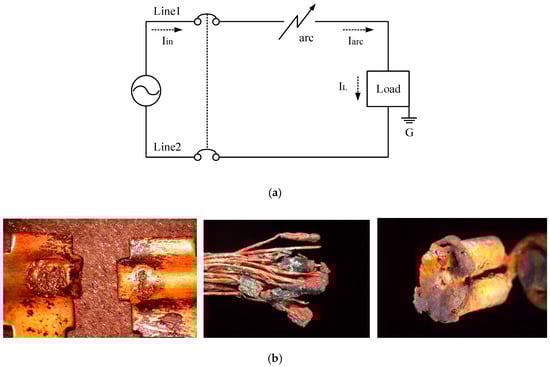 Arc faults generated in an electric circuit are divided into series arcs and parallel arcs according to the path of faulty current [,,,,]. A series arc occurs at an incomplete connection within the same phase when a cord is loosely connected or there is a small gap between a cord and terminal. The arc current flowing in the circuit is not higher than the load current because it is limited by the load connected in series. Meanwhile, a parallel arc occurs between conductors within different phases such as line to neutral or line to ground. When damaged wires with different voltages are close together, the arc current flows into the circuit. The parallel arc is protected by protection devices such as an earth leakage breaker (ELB) and a fuse. Figure 2 shows a series arc with a load and evidence of accidental fires caused by a series arc.