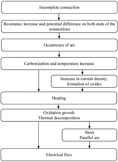 A series arc fault is generated in series with the load due to incomplete connections between cords, and a loose connection between a cord and terminal [,]. The contact resistance increases and arc current flows with high temperature due to potential differences for a few seconds [,]. When an arc discharge occurs repeatedly, the local connection surface is carbonized and oxides are produced due to high temperatures. When the temperature exceeds 300 °C, thermal decomposition appears in the insulated coating of a cord and eventually a series arc fault occurs, resulting in an electric fire. Although it is not directly ignited by the series arc current when the insulating material is melted, an electrical fire may occur due to a short circuit fault or ground fault. Figure 3 shows the typical mechanism for fire generation by a series arc.