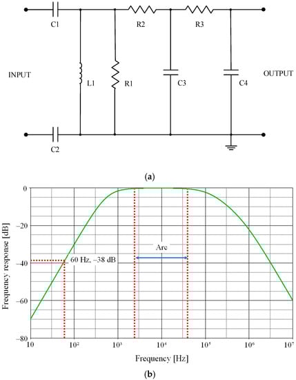 In the previous study, discrete wavelet transform (DWT) based on multiresolution analysis (MRA) was performed for series arcs depending on the types of resistive load, motor, and SMPS, which are mainly used for low-voltage electrical devices such as heaters, computers, refrigerators, and air conditioners, and the optimal detection frequency ranges were selected from 2.4 to 39 kHz []. A band-pass filter was designed based on the results in Figure 5a. The bandpass filter consists of a high-pass filter and two low-pass filters as follows.