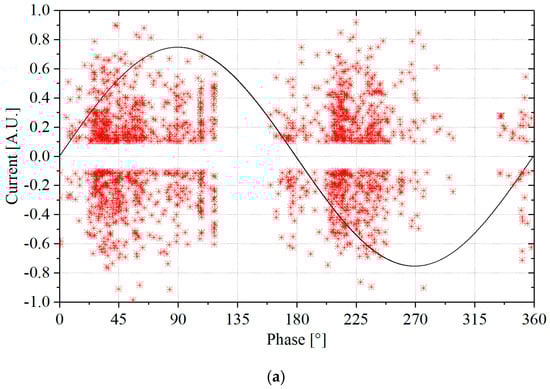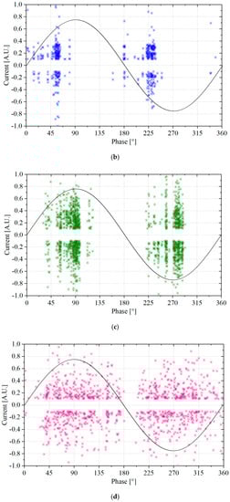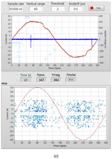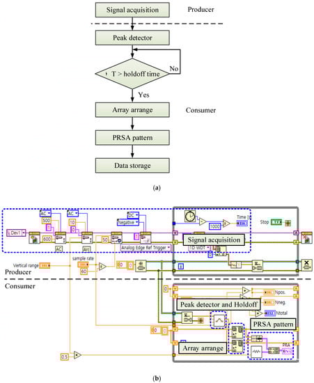 The arc signals are affected by the phase of arc occurrence and types of loads, and the phase of arc occurrence depends on the type of load. In this paper, a PRSA analysis method and virtual instrument (VI) were designed to analyze characteristics of arc signals, as shown in Figure 6. The analysis method collected arc signals generated for one cycle of 0 to 360° through the band-pass filter. The collected arc signals were displayed on the front panel in real time and are accumulated to form PRPS patterns. While the arc signals can be processed when they are intermittently inputted, it is hard to process them in real time when hundreds of them are inputted for one cycle. Therefore, a producer‒consumer structure was applied to have multithreading function. When a number of arc signals are continuously measured, the signals that are not processed in real time accumulate in the database. After that, the magnitude and occurrence of saved arc signals are analyzed quickly and uniformly when an arc signal does not occur. Each data point was stored in an array and the maximum values, in accordance with phases, were stored more than threshold level. The threshold level was higher than the noise level. The noise level was determined to be twice or more, considering the actual operating environment with various harmonics. The phases were measured by a differential probe.