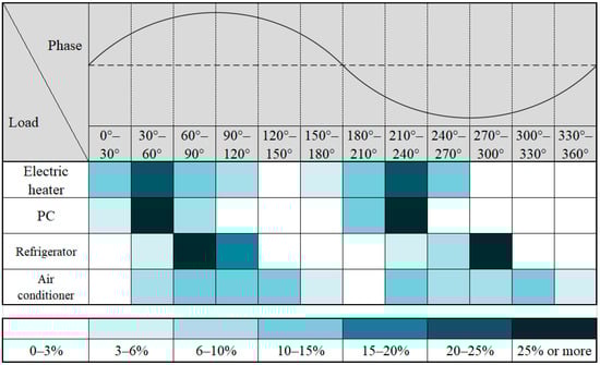 Figure 8 shows results of phase distribution of arc signals every 30° according to types of loads. The phase of arc signals from the heater load was distributed from 0° to 120° and 150° to 270°. The arc occurrence from 120° to 150° and from 270° to 360° was less than 3% of the total arc occurrence rate. On the other hand, the rate of arc occurrence from 30° to 60° and 210° to 240° were each over 20–25%, resulting in nearly half of the total arc occurrence rate. For the computer load, most of the arc signals were distributed from 0 to 90° and 180° to 240°. The highest rate of arc occurrence was over 25% from 30° to 60° and from 210° to 240°, while the arc signals from 90 to 180° and from 240° to 360° were less than 3% of the total arc occurrence rate. It showed similar characteristics of phase distribution to the heater. For the refrigerator load, most of the arc signals were distributed from 30° to 120° and 210° to 300°. More than 25% of total arc occurrence was from 60° to 90° and 270° to 300°. Meanwhile, the least arc occurrence was from 0° to 30°, 120° to 210°, and 300° to 360°, less than 3% of the total arc occurrence rate.