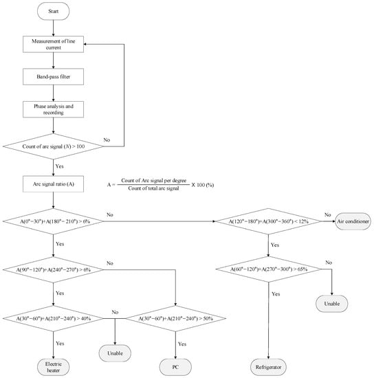 The new algorithm was designed to identify types of loads caused by an arc, based on the characteristics of phase distribution difference, depending on types of loads. The arc signal measured in real time is counted by phases and the ratio of arc signals by phases is estimated. Figure 9 shows the flowchart of a phase-resolved series arc algorithm for load classification. Table 1 shows the identification criteria based on the algorithm. The criteria for identification are designed by comparing the phases in which the arc mostly occurs, and the algorithm identifies types of loads when the number of arc signals is over 100, to improve the accuracy.