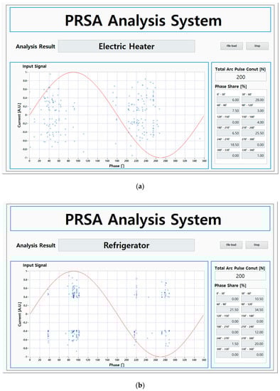 To verify the algorithm proposed in this paper, two case studies were performed to identify types of loads when an arc occurred in the distribution line connected with a load. Figure 10 shows the results of the PRSA algorithm for a heater and a refrigerator. For a heater, as shown in Figure 10a, the rate of arc occurrence was more than 6% from 0° to 30°, 180° to 210°, 90° to 120°, and 240° to 270°, and more than 40% from 30° to 60° and 210° to 240°. Based on the results of the PRSA analysis, the algorithm determined that the arc occurred in the heater. Figure 10b shows that the refrigerator was identified by the algorithm because the rate of arc occurrence was 0% from 120° to 180° and 300° to 360° and more than 76% from 60° to 120° and 270° to 360°.