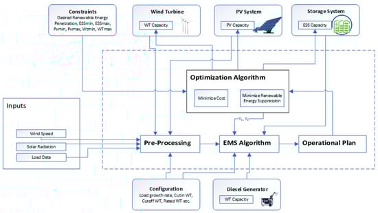 The data that constitute the input to the system have records for multiple instances of wind speed, solar radiation, and load demand. The input data are given to the preprocessing unit, which preprocesses the data and aggregates the data of all the instances. The data have many missing entries against the parameters mentioned above. In addition, some of the columns were not in a consistent format. The preprocessor removes all such anomalies, cleans the data, and forwards it to the next block. The next important module is the optimization algorithm. The optimization algorithm takes cleaned data from the preprocessor module. It also takes system constraints and runs the algorithm to find optimal values. When the optimization algorithm finishes all the iterations and achieves the optimal results, the optimal values are given to the EMS algorithm, which gives an operation plan for the working of the microgrid.