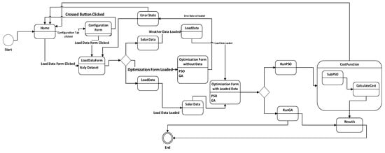 A state diagram represents the working state of the system and the different state transitions during the life cycle of program execution. When the system is started, it connects to the main interface. From the main interface, the state can be changed to the configuration form. From the configuration form, the user can go to either load data, in case the load data button is clicked, or an error state if other buttons are clicked. The error state always leads to the main interface. From the load data state, two operations can be performed: load data loading and weather data loading. The state can also be changed to the optimization interface, but that will lead to the error state. From the optimization interface, three states can be triggered, including RunPSO and RunGA. In PSO, a subPSO state is triggered, the results are stored, and the process ends. In GA, the subPSO state is not triggered, and only the result is stored, as shown in Figure 2.