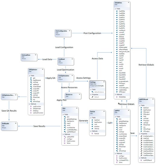 The class diagram of the architecture is shown in Figure 3. There are different classes, each of which is responsible for a certain functionality. There are global classes such as GlobalData, which is a bucket storing all the data and methods that can be commonly consumed by other classes. There are three optimizer classes. The rPSO algorithm has two classes, PSO and SubPSO, which overall implement the algorithm. Both PSO and SubPSO generate a particle class that represents the particle and its movement to find the solution. In either case, the results are stored in the respective result class and saved using the ResultsForm class.