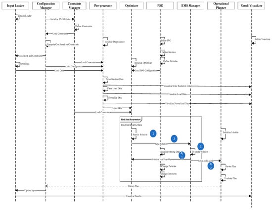 In this section, the interaction model of different components of the system is illustrated. The sequence of operations is shown in Figure 4. First off, all modules are initialized. The configuration manager loads the configuration data and receives constraints from the constraints manager. The configuration, along with constraints, is provided to the input loader. The input loader loads the data and supplies it to the pre-processor where the data are normalized, and anomalies are fixed using the interpolation. The data are supplied along with the configuration data and constraints to the optimizer. The PSO provides the particle information and the velocity to the optimizer, and the optimizer optimizes it with a PSO configuration and supplied data and constraints. The results are provided to the configuration manager and the operational plan. The operational plan devises a plan based on the EMS algorithm and gives the operational plan to the results visualizer. The visualizer visualizes the results with a graph and visual effects, which helps monitor the system.
