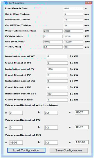 The main interface that shows all the initial data in the form is shown in Figure 5. The prepopulated values are necessarily the reflection of the business requirements of the microgrid. These initial configurations can be changed if the requirements change, which makes the system very flexible. This configuration form can also act as a placeholder for optimal values. Thus, when the optimizer runs, the optimal values replace the initial values for the proper working of the microgrid. The value can be saved, and if the initial values are needed again, they can be reloaded using the load configuration click handler.